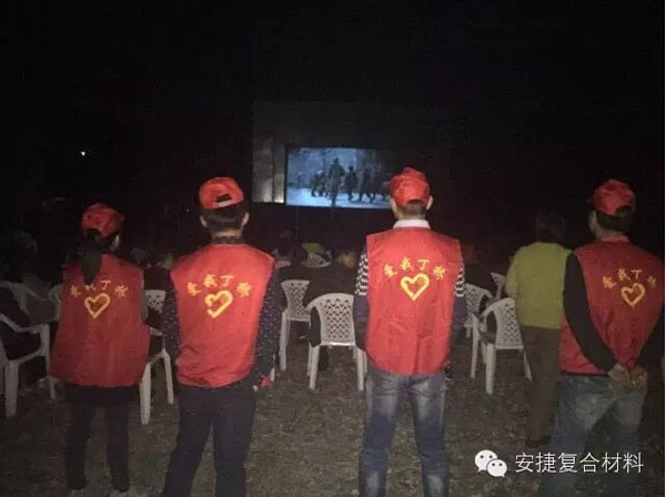 晚上6点半,村民们闻讯从四面八方赶来,纷纷来看《智取威虎山》这部经典电影。在公司“安捷公益”这块场地上可是说是座无虚席。